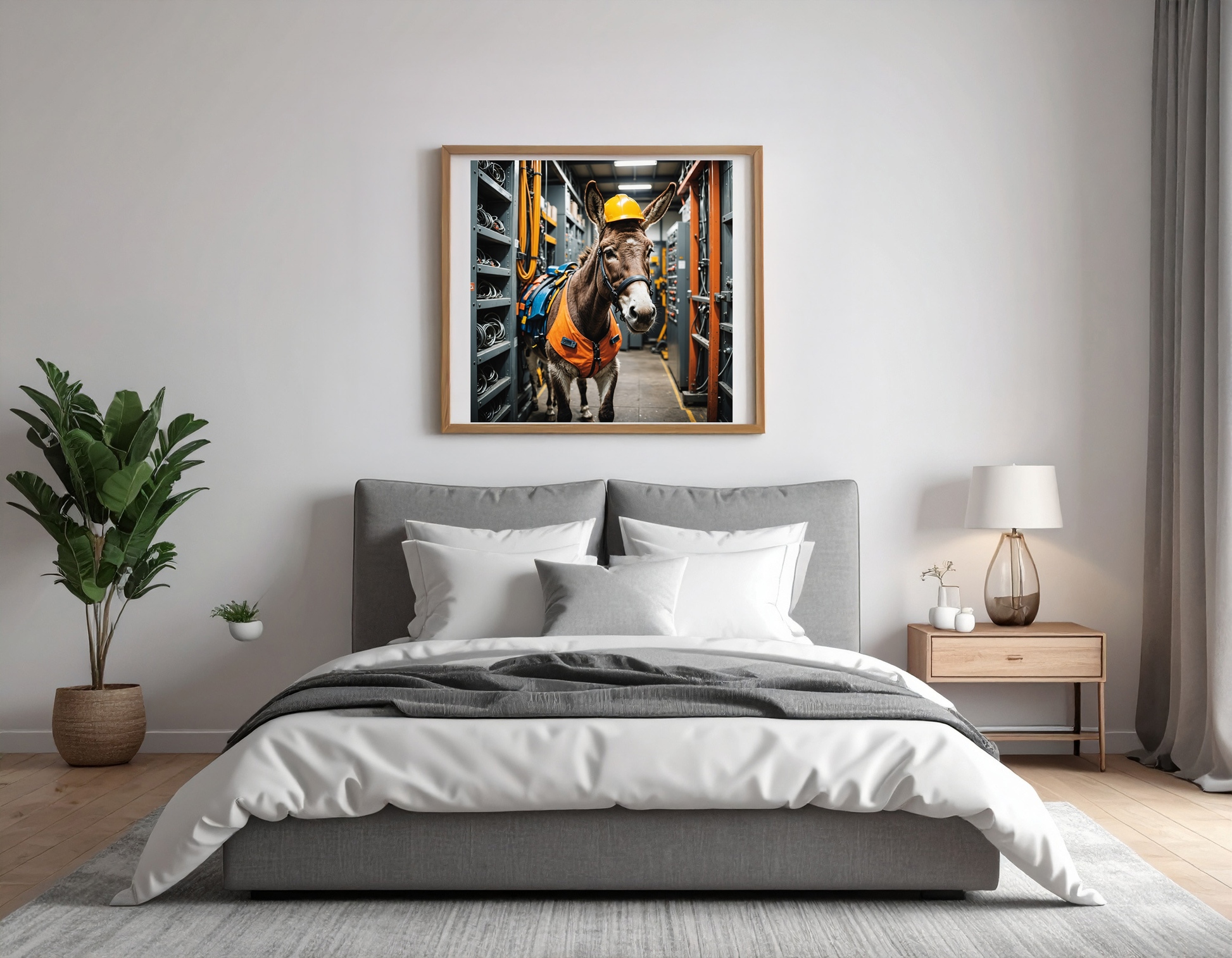 Cute donkey in safety climbing equipment working in a machine room